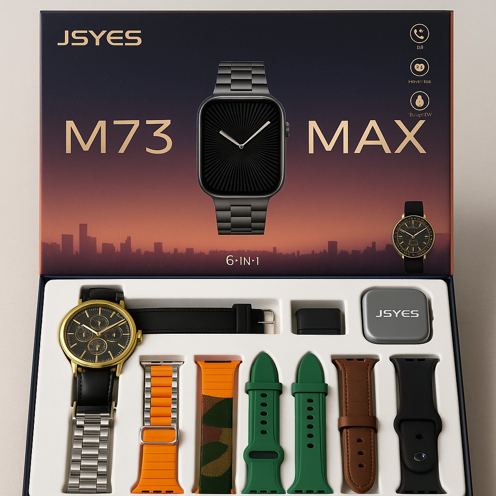 یکی از جذاب ترین ویژگی های ساعت هوشمند M73، اقلام همراه کامل آن است. شما با خرید این ساعت، علاوه بر خود اسمارت واچ، یک ساعت مچی آنالوگ دایره ای با بدنه طلایی و بند چرمی مشکی و همچنین 6 بند متنوع (شامل بند رولکسی فلزی، بند لوپ پارچهای و چندین بند سیلیکونی) دریافت میکنید. این تنوع بینظیر به شما اجازه میدهد تا ساعت خود را به راحتی با هر نوع لباس و استایلی، از ورزشی و روزمره گرفته تا رسمی، هماهنگ کنید.
