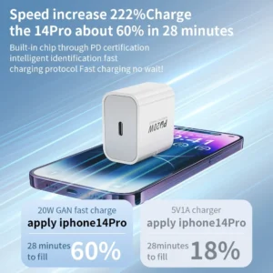 این شارژر دیواری با توان خروجی 20 وات و پشتیبانی از فناوری Power Delivery (PD)، گوشی شما را با سرعتی بی نظیر شارژ می کند. این قابلیت به خصوص برای گوشی های آیفون سری 8 تا 14 که از فناوری شارژ سریع PD پشتیبانی می کنند، بسیار کاربردی است. با این آداپتور فست شارژ، می توانید در مدت زمان کوتاهی، مثلاً حدود 10 دقیقه، تا 30 درصد از باتری گوشی خود را پر کنید و زمان انتظار برای شارژ کامل را به حداقل برسانید. این سرعت شارژ، زندگی پرمشغله امروزی را بسیار آسان تر می کند.