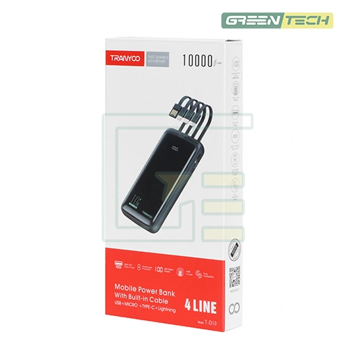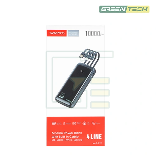یکی از ویژگیهای متمایز این پاوربانک ترانیو مدل T-D10، تنوع پورتهای ورودی و خروجی آن است که امکان سازگاری با انواع دستگاهها را بهطور کامل تضمین میکند. پورتهای ورودی شامل Type-C و Micro USB بوده و پورتهای خروجی آن شامل USB، Type-C، Lightning و Micro میباشند. علاوه بر این، وجود چهار کابل سرخود (Type-C، Lightning، Micro USB و USB) باعث شده تا بدون نیاز به حمل کابل اضافه، همواره آماده استفاده باشید.