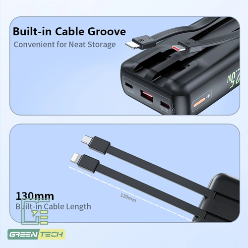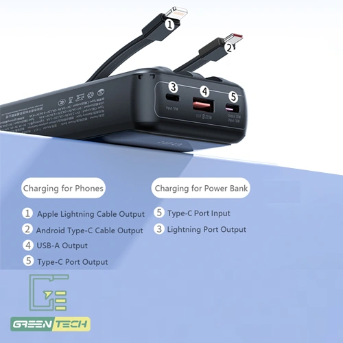 این شارژر همراه نه تنها دارای کابل های خروجی داخلی است، بلکه از طریق پورت Type-C امکان ورودی شارژ را هم فراهم می کند. این انعطاف پذیری در ورودی و خروجی، باعث می شود بتوانید پاوربانک خود را با استفاده از کابل Type-C شارژ کنید و همزمان از پورتهای خروجی USB-A و Type-C (علاوه بر کابلهای داخلی) برای شارژ دستگاه های مختلف بهره ببرید.