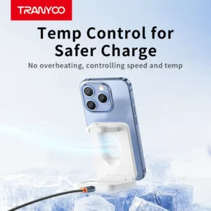 شارژر بی سیم 3 در 1 T-WF3 با ابعاد 96x65x30 میلی متر در حالت تاشده، بسیار جمع و جور و قابل حمل است. بدنه این شارژر از ترکیب مواد ABS و پلی کربنات (PC) ساخته شده که علاوه بر استحکام و دوام بالا، به دفع موثر گرما نیز کمک می کند. طراحی آن شامل یک مکانیزم تاشو دوگانه است که به شما اجازه می دهد به راحتی آن را برای حمل یا نگهداری جمع کنید. این شارژر از 18 آهنربای قوی N55 بهره می برد که اتصال مغناطیسی بسیار محکم و پایداری را برای گوشی و ساعت هوشمند شما فراهم می کند. سطح شارژ گوشی با یک پنل مغناطیسی با ظاهر “کریستال یخ” پوشانده شده که به خنک کنندگی فیزیکی و ظاهری جذاب کمک می کند. همچنین، وجود یک چراغ خواب محیطی، به کاربردپذیری این شارژر در شب می افزاید.